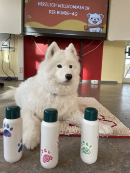 Shari wählte das Thema der heutigen AG aus. Wie das ging? Sie stubste eine der drei Flaschen um. Welches Thema wurde behandelt? Eines der wichtigsten Themen überhaupt: Die Körpersprache des Hundes. Die SchülerInnen, die an der AG teilnahmen, lernten durch anschauliche Fotos und Videos meiner Hunde, die Körpersprache der Hunde kennen. Sie lernten auch, wie wir uns Hunden nähern, indem sie Hundebegegnungen auf Fotos im Anschluss der Erarbeitung analysierten. Das Kahoot!-Quiz am Ende des Nachmittags meisterten sie mit Bravour.